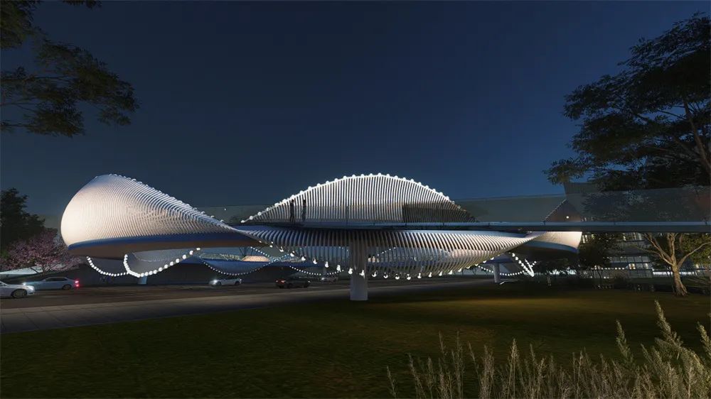設(shè)計環(huán)形人行天橋,猶如一朵盛開的嬌艷的花,有機聯(lián)系起項目的南北地塊,同時兼顧新區(qū) 大道的人行過街功能,結(jié)合燈光藝術(shù)營造,也將成為該片區(qū)一個標志性的打卡點,象征著雅安因多樣而美麗,因共生而繁盛。基因環(huán)圍欄展示雅安特色物種。地面燈光按植物花色進行分段布置,同時通過投影設(shè)備和交互式燈光等設(shè)施,增加游人體驗感。環(huán)形橋跨越機動車道,基因環(huán)的出現(xiàn)開始了生物密碼的探索之旅。