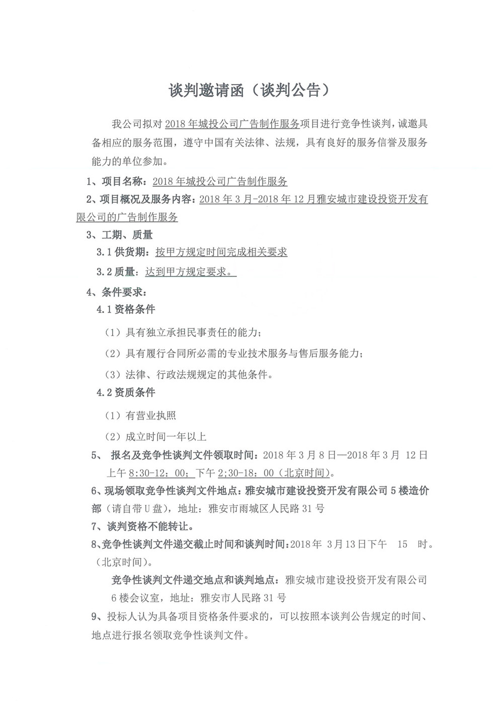 2018年城投公司廣告制作服務(wù)項(xiàng)目談判邀請(qǐng)函(談判公告)
