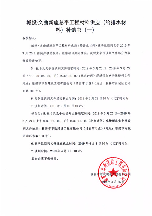 城投·文曲新座總平工程材料供應(給排水材料)競爭性談判公告補遺一