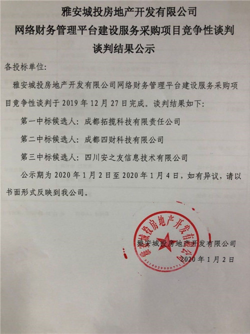 雅安城投房地產(chǎn)開發(fā)有限公司網(wǎng)絡(luò)財(cái)務(wù)管理平臺(tái)建設(shè)服務(wù)采購項(xiàng)目競(jìng)爭(zhēng)性談判結(jié)果公司