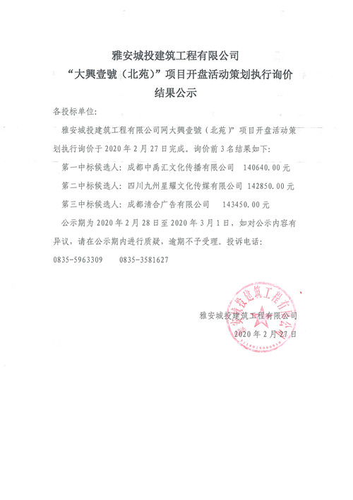 城投建工“大興壹號(北苑)”項目開盤活動策劃執(zhí)行詢價結果公示