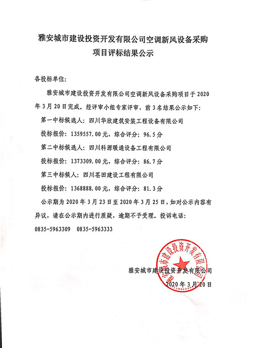 城投公司空調(diào)新風(fēng)設(shè)備采購項目評標結(jié)果公示