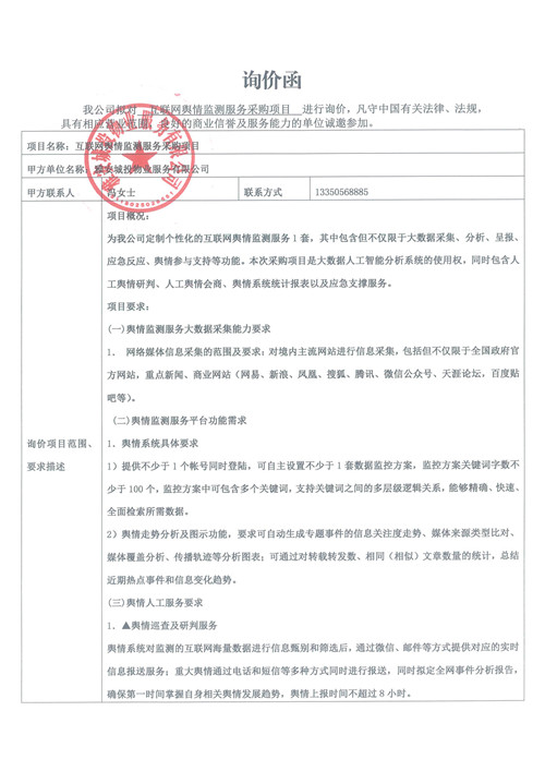 城投物業(yè)公司互聯(lián)網(wǎng)輿情監(jiān)測(cè)服務(wù)采購(gòu)項(xiàng)目詢價(jià)函