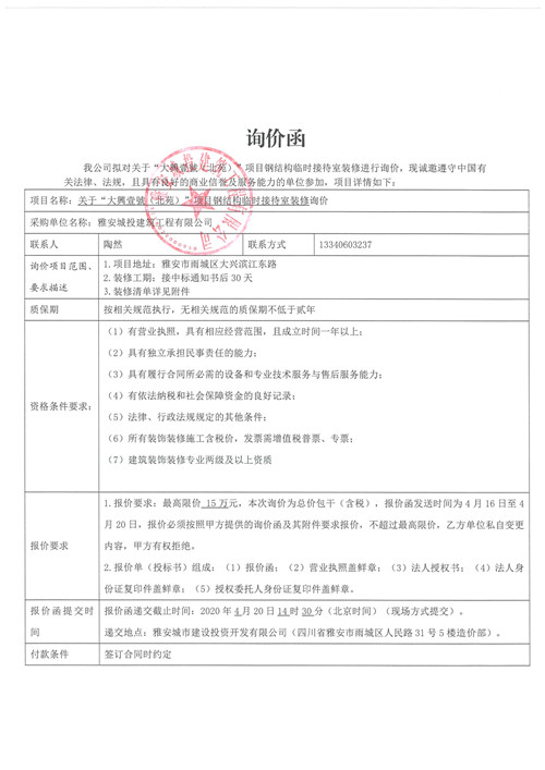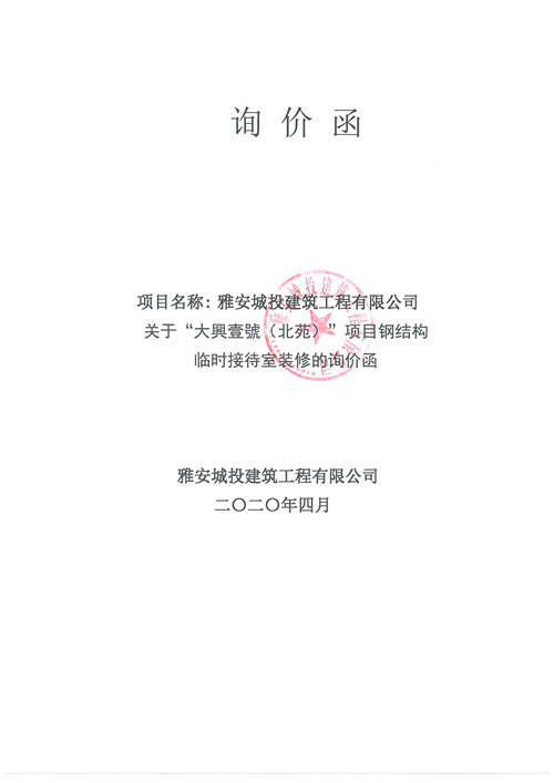 城投建工“大興壹號(北苑)”項目鋼結(jié)構(gòu)臨時接待室裝修的詢價函