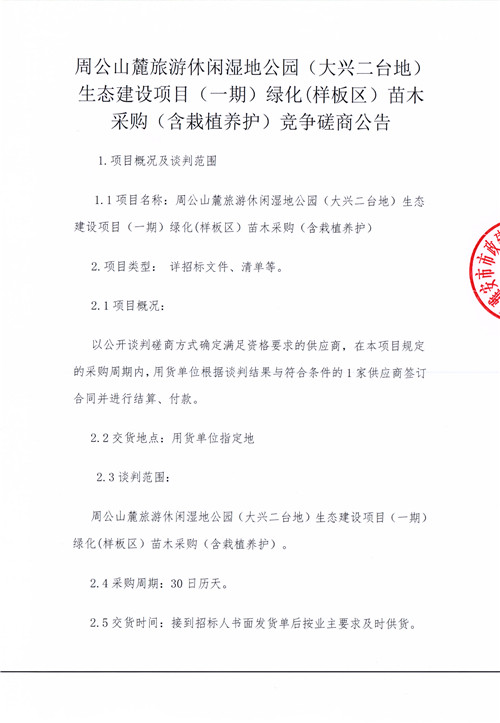 周公山麓旅游休閑濕地公園(大興二臺(tái)地)生態(tài)建設(shè)項(xiàng)目(一期)綠化(樣板區(qū))苗木采購(含栽植養(yǎng)護(hù))競爭磋商公告