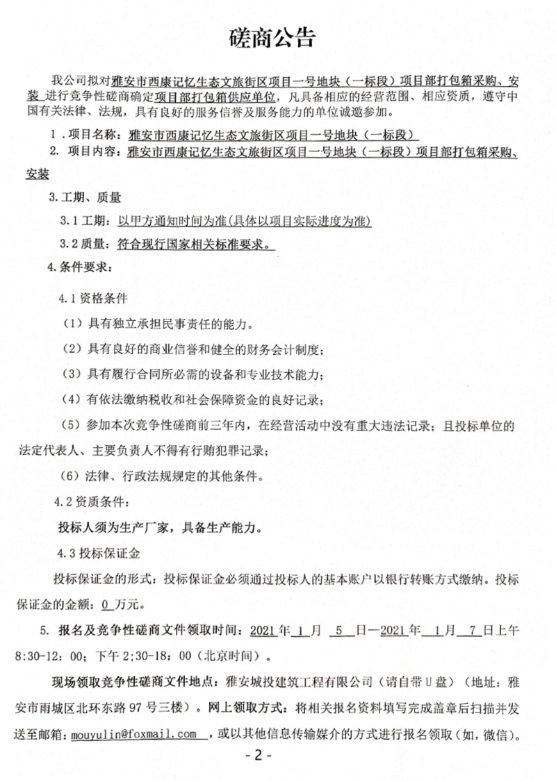 雅安市西康記憶生態(tài)文旅街區(qū)項(xiàng)目一號(hào)地塊(一標(biāo)段)項(xiàng)目部打包箱采購、安裝競爭性磋商公告