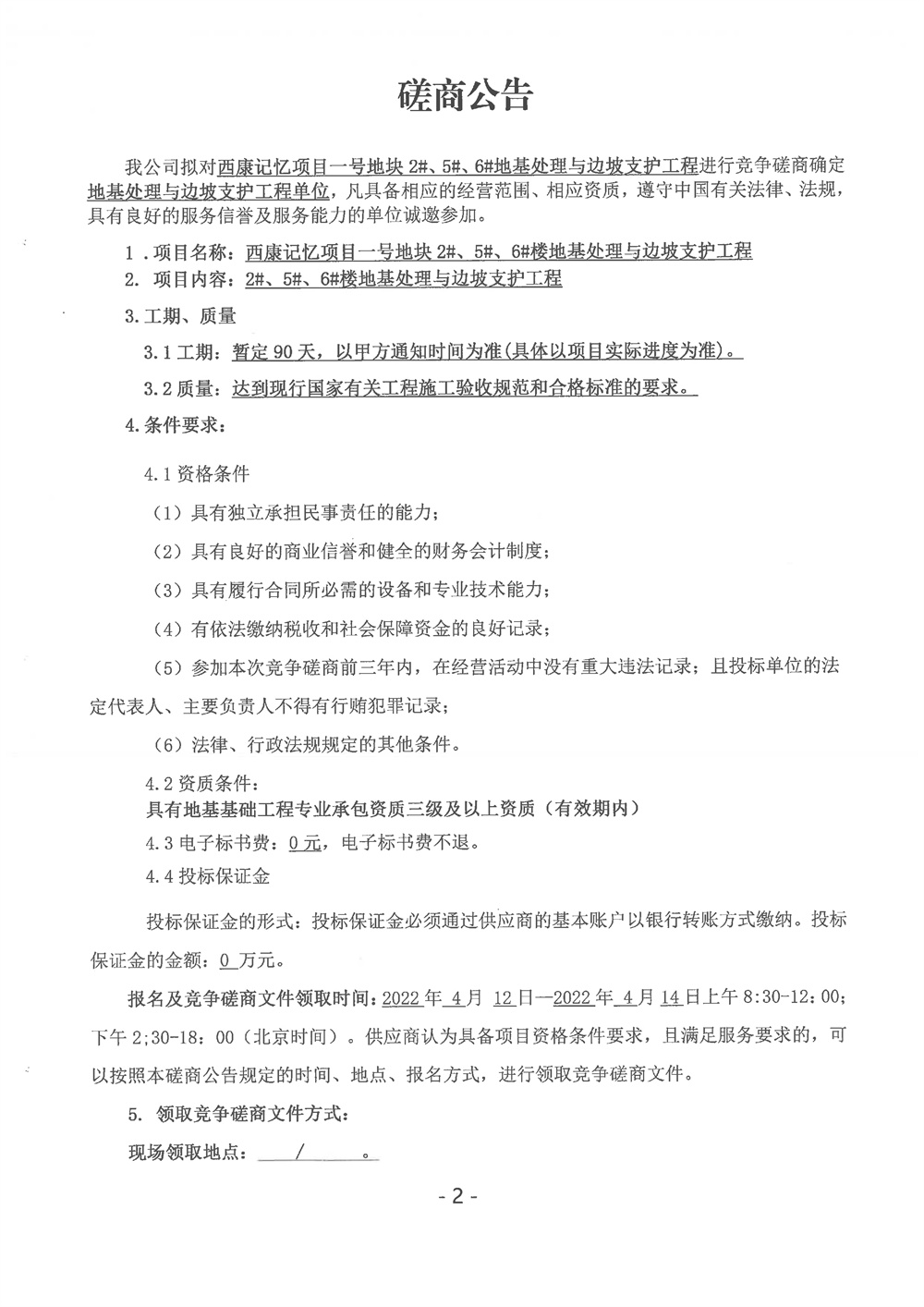 西康記憶項目一號地塊2#、5#、6#地基處理與邊坡支護工程磋商公告