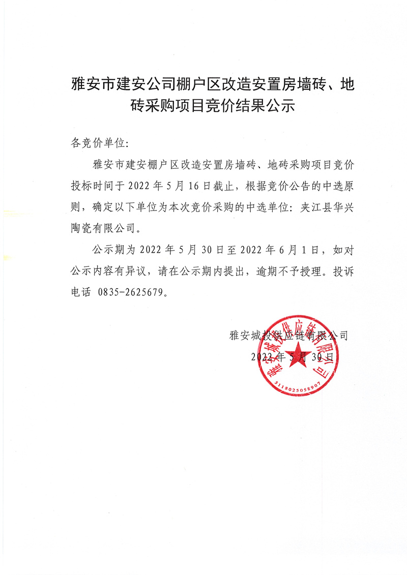 雅安市建安公司棚戶區(qū)改造安置房墻磚、地磚采購(gòu)競(jìng)價(jià)項(xiàng)目競(jìng)價(jià)結(jié)果公示