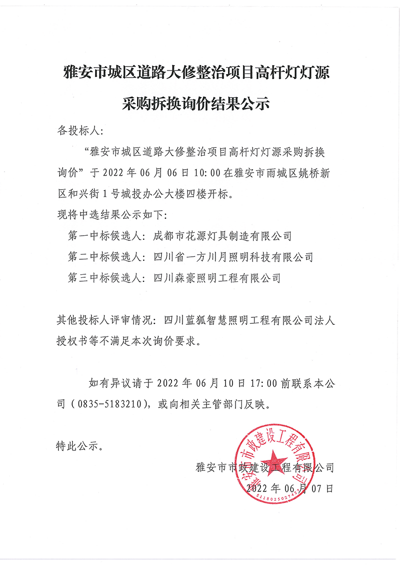 雅安市城區(qū)道路大修整改項目高桿燈燈源采購拆換詢價結(jié)果公示