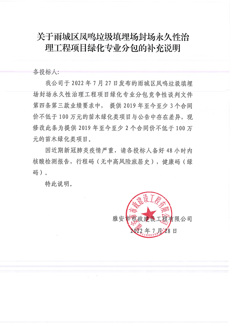 關(guān)于雨城區(qū)鳳鳴垃圾填埋場封場永久性治理工程項目綠化專業(yè)分包的補充說明