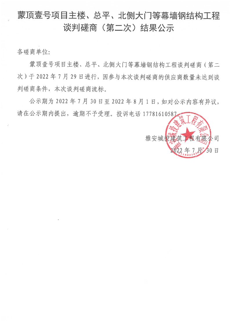 蒙頂壹號項目主樓、總坪、北側(cè)大門等幕墻鋼結(jié)構(gòu)工程談判磋商(第二次)結(jié)果公示