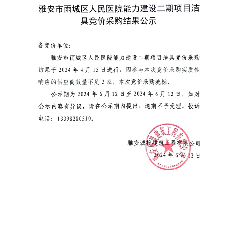 雅安市雨城人民醫(yī)院能力建設(shè)二期項(xiàng)目潔具競(jìng)價(jià)采購(gòu)結(jié)果公示