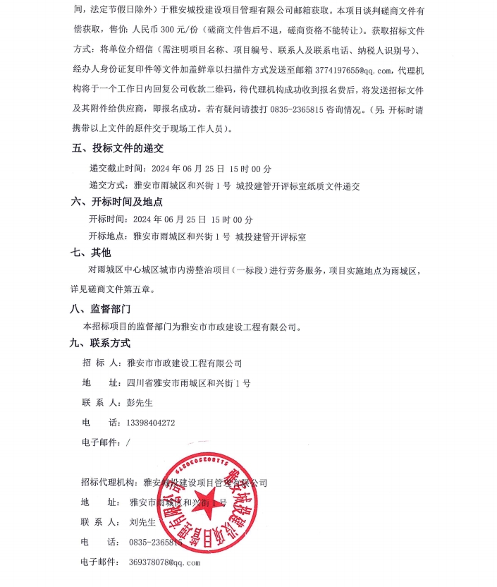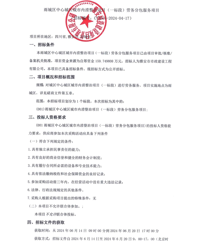 雨城區(qū)中心城區(qū)城市內(nèi)澇整治項目(一標段)勞務分包服務項目公告