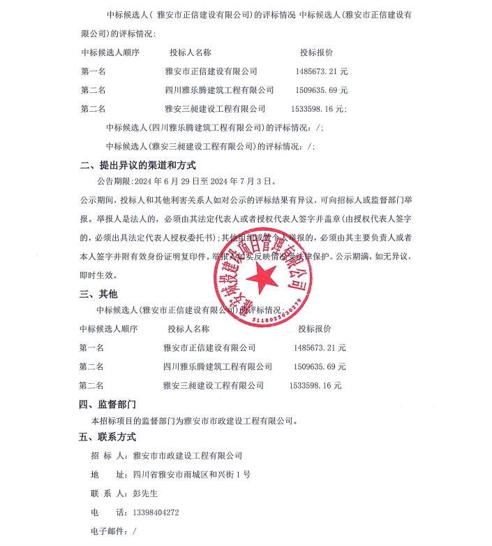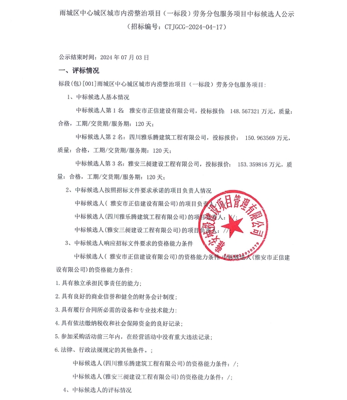 雨城區(qū)中心城區(qū)城市內(nèi)澇整治項目(一標(biāo)段)勞務(wù)分包服務(wù)項目中標(biāo)候選人公示