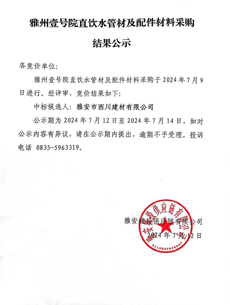 雅州壹號(hào)院直飲水管材及配件材料采購(gòu)結(jié)果公示