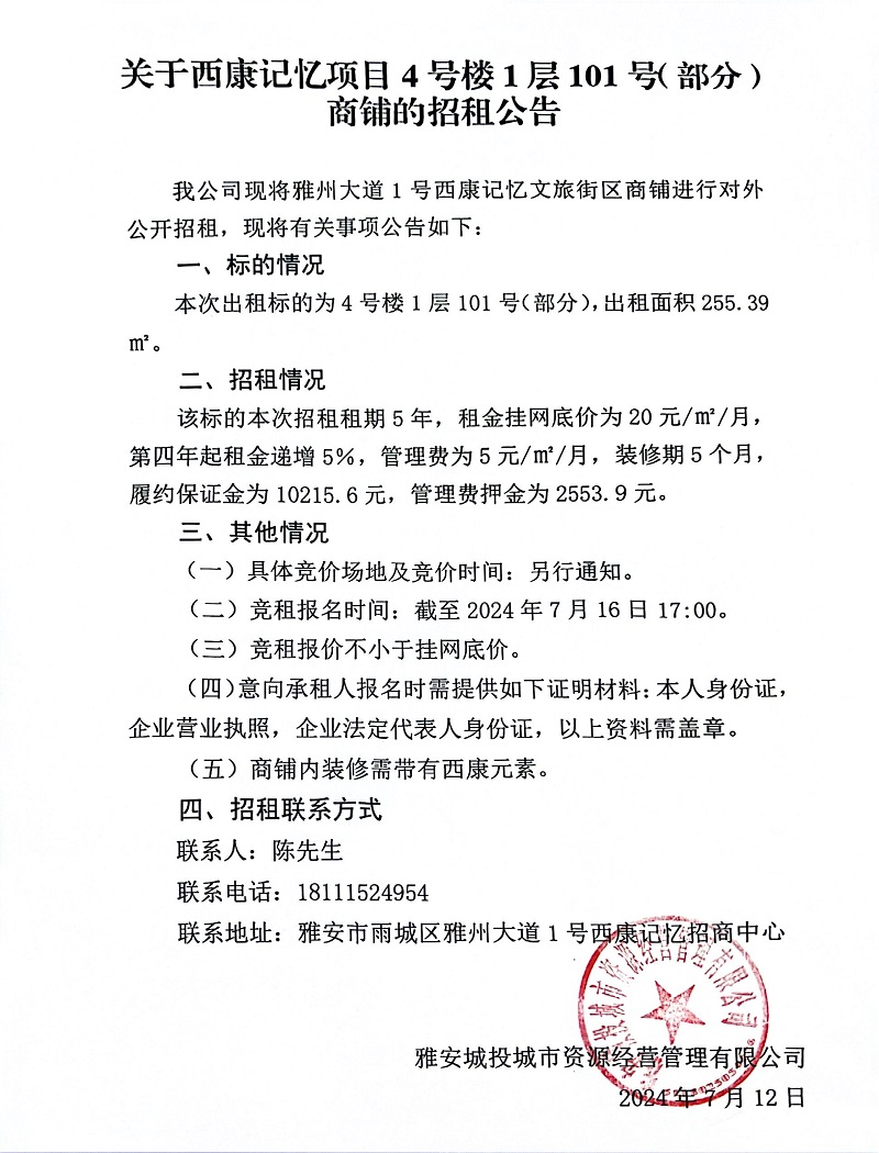 關(guān)于西康記憶項目4號樓1層101號(部分)商鋪的招租公告