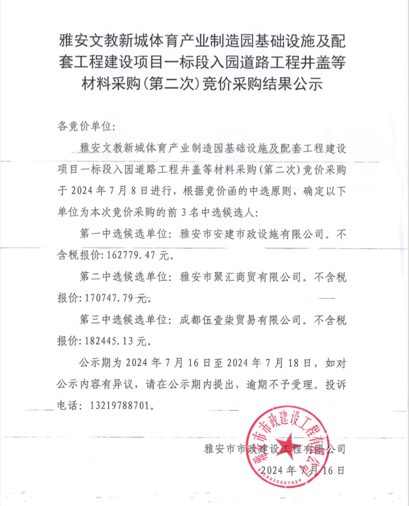 雅安文教新城體育產(chǎn)業(yè)制造園基礎(chǔ)設(shè)施及配套工程建設(shè)項(xiàng)目一標(biāo)段入園道路工程井蓋等材料采購(gòu)(第二次)競(jìng)價(jià)采購(gòu)結(jié)果公示