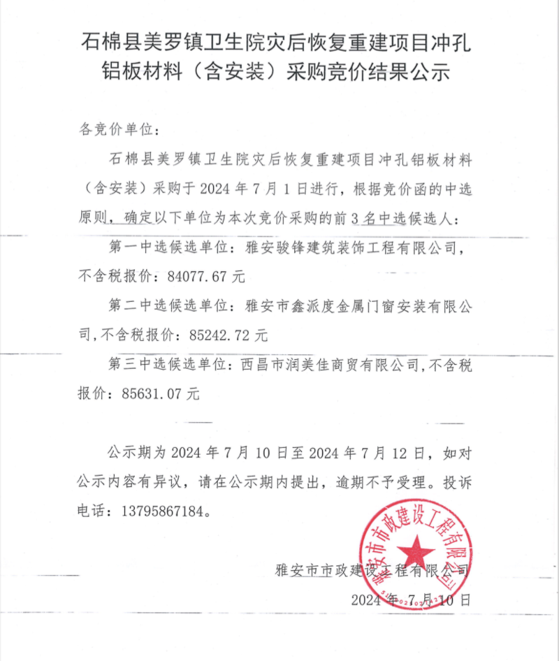 石棉美羅鎮(zhèn)衛(wèi)生院災(zāi)后恢復(fù)重建項(xiàng)目沖孔鋁板材料(含安裝)采購(gòu)競(jìng)價(jià)結(jié)果公示