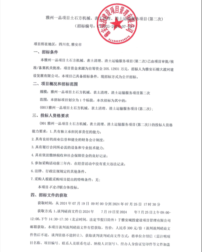 雅州一品項目土石方機(jī)械、表土清理、渣土運(yùn)輸服務(wù)項目(第二次)公告