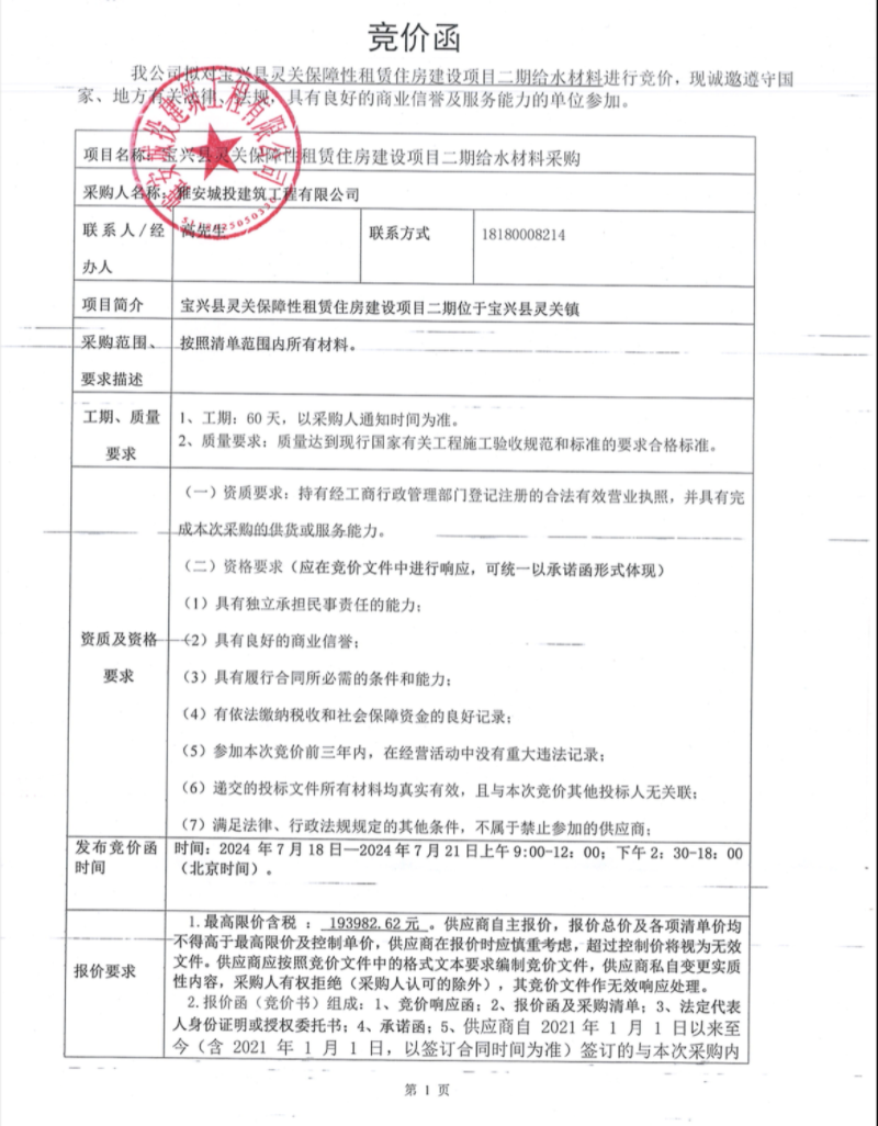 寶興縣靈關(guān)保障性租賃住房建設(shè)項(xiàng)目二期給水材料競價(jià)公告