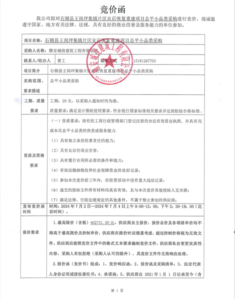 石棉縣王崗坪集鎮(zhèn)片區(qū)災(zāi)后恢復(fù)重建項(xiàng)目總平小品類采購競價公告