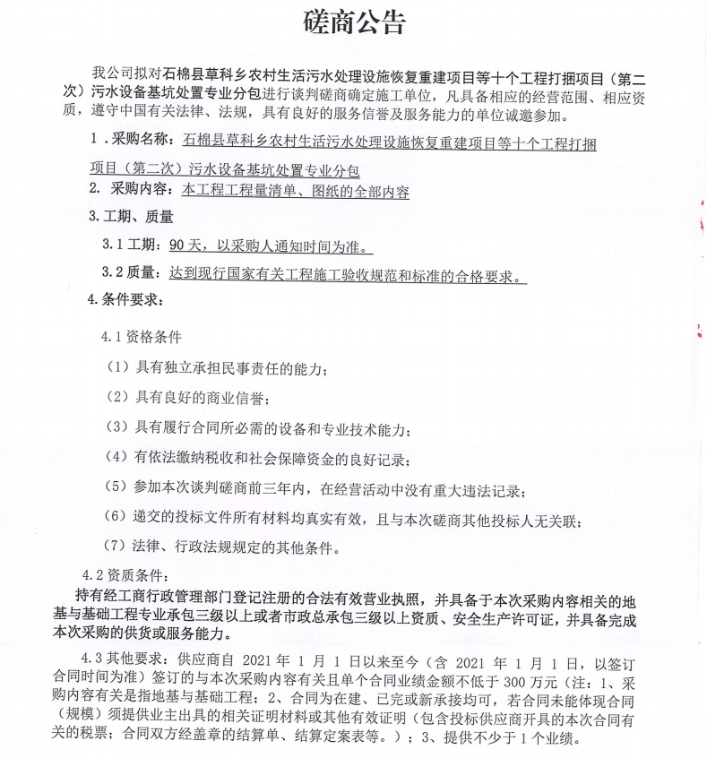 石棉縣草科鄉(xiāng)農(nóng)村生活污水處理設(shè)施恢復(fù)重建項(xiàng)目等十個(gè)工程打捆項(xiàng)目(第二次) 污水設(shè)備基坑處置專業(yè)分包采購(gòu)談判磋商公告