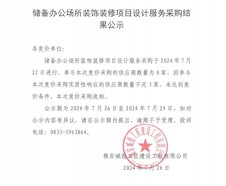 儲(chǔ)備辦公場(chǎng)所裝飾裝修項(xiàng)目設(shè)計(jì)服務(wù)采購(gòu)結(jié)果公示