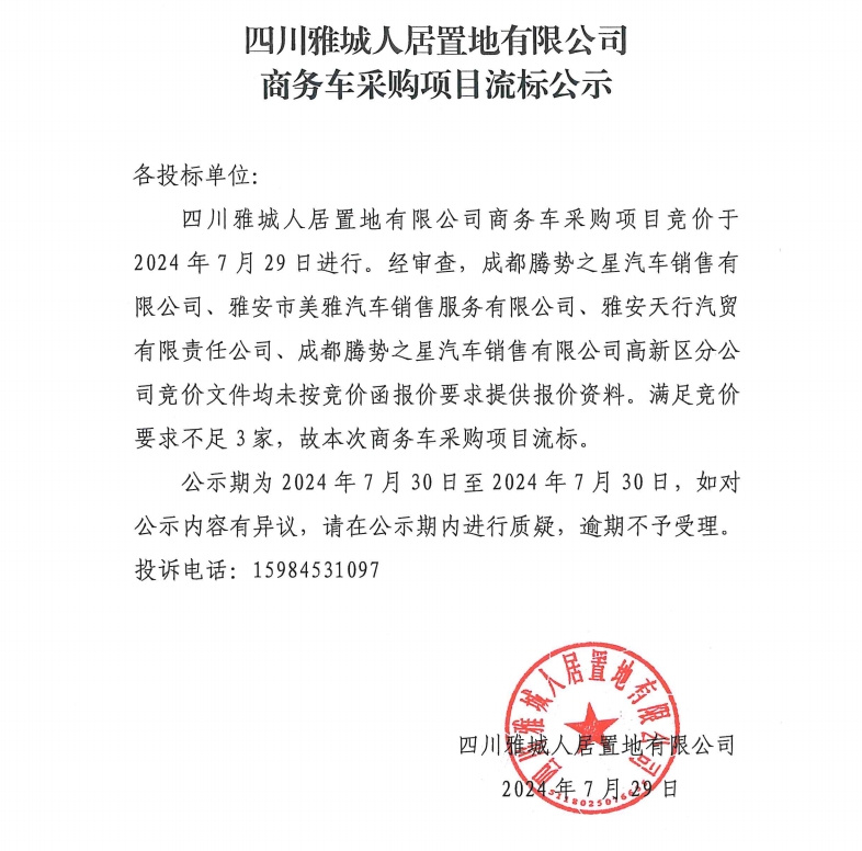 四川雅城人居置地有限公司商務(wù)車采購項目流標公示