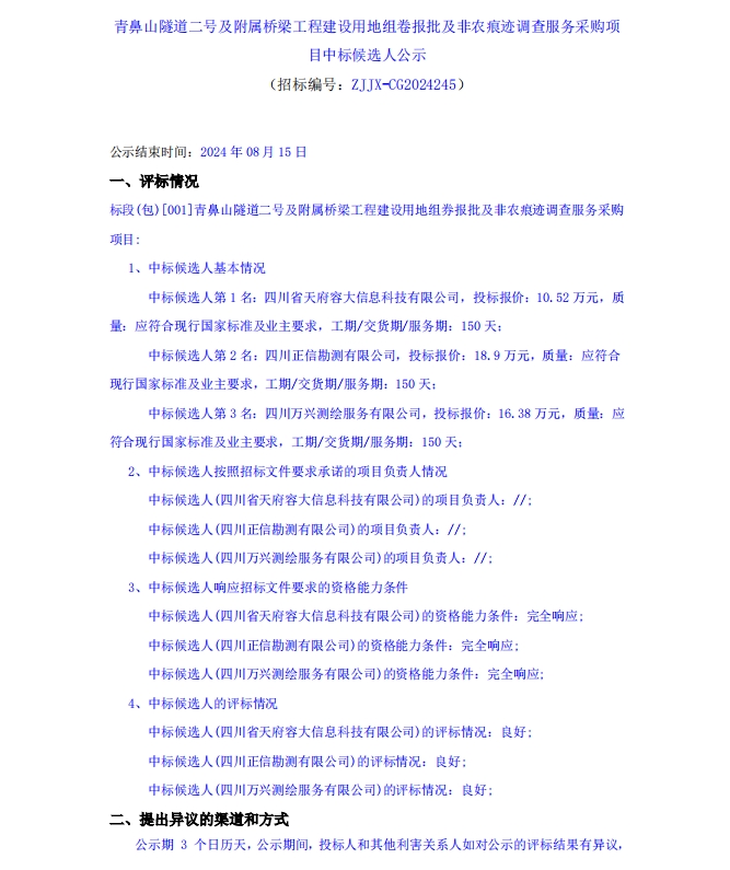 青鼻山隧道二號(hào)及附屬橋梁工程建設(shè)用地組卷報(bào)批及非農(nóng)痕跡調(diào)查服務(wù)采購項(xiàng)目中標(biāo)候選人公示