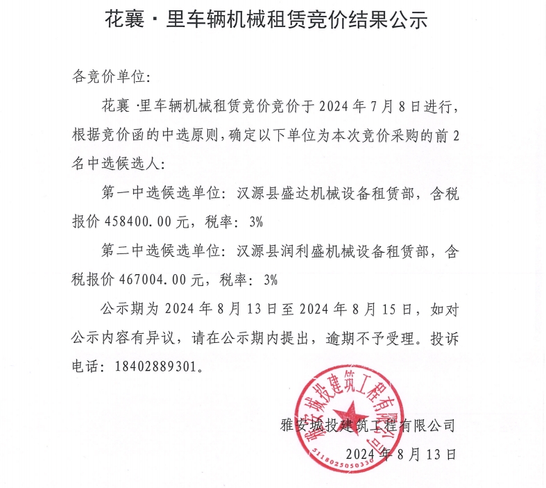 花襄·里項目車輛機械租賃競價結(jié)果公示