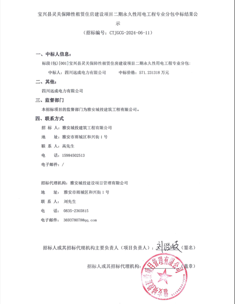 寶興縣靈關(guān)保障性租賃住房建設項目二期永久性用電工程專業(yè)分包中標結(jié)果公示