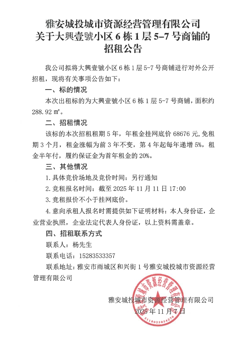雅安城投城市資源經(jīng)營管理有限公司關于大興壹號小區(qū)6棟1層5-7號商鋪的招租公告